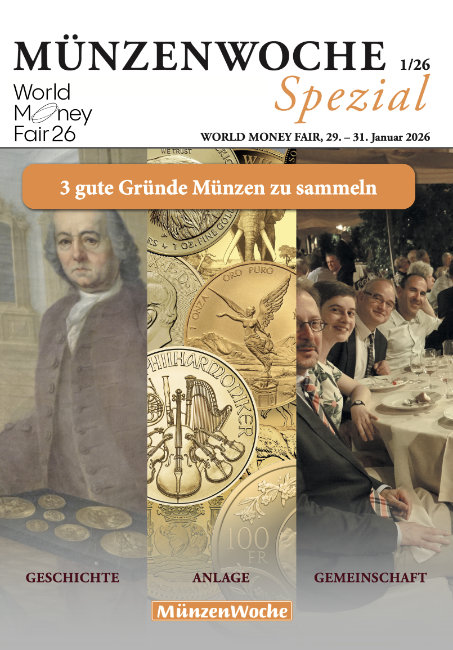 Seit 2015 publiziert die MünzenWoche anlässlich großer numismatischer Events die MünzenWoche Spezial, so auch anlässlich der World Money Fair in Berlin. Sie findet vom 29. bis zum 31. Januar 2026 im Estrel Hotel statt und ist für Besucher von 10.00 bis 18.00 Uhr geöffnet. Kommen Sie an unseren Stand, gleich in der Nähe des Eingangs in der Galerie-Passage. Unter der Standnummer G2 finden Sie uns auf dem Weg zur Rotunde.